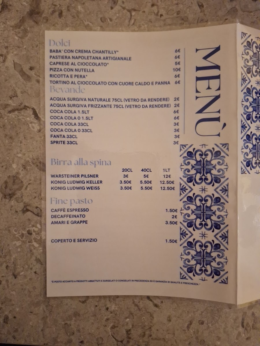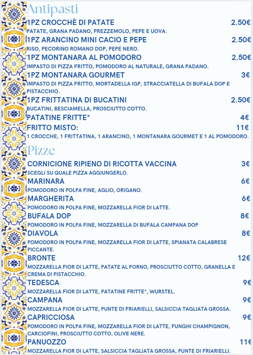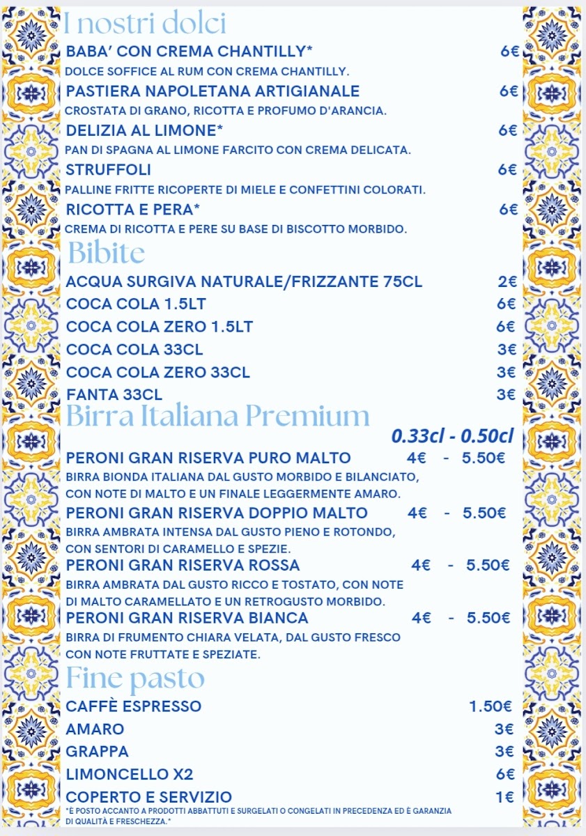 Grani Antichi Pizzeria Napoletana offers a diverse and delicious menu that caters to various tastes, starting with its pizza selection. You can indulge in classic options like the Diavola, with its spicy kick, or the Pizza Fritta, a deep-fried delight. For something lighter, try the Schiacciata Con Sale E Olio EVO Trevigiana, or the hearty Panuozzo. To accompany your meal, the drink menu includes refreshing options such as Coca-Cola Zero (33cl), Peroni Doppio Malto (33cl OFFERTA), and Fanta Lattina (330ml). The Le Fritture section is perfect for those craving a savory snack, offering choices like a single Frittatina Di Bucatini, a delicious Montanara Al Pomodoro, and various box options such as the MINI Box Fritti Mix (4 pieces) and the larger MAXI Box Fritti Mix (8 pieces). For dessert, the La Pizza Alla Nutella provides a sweet end to the meal, alongside traditional treats like the Baba' Con Crema Chantilly, Ricotta E Pera Pastiera Artigianale, and a rich selection of classic desserts. The menu offers a great balance of savory and sweet, with a focus on quality ingredients and authentic flavors.